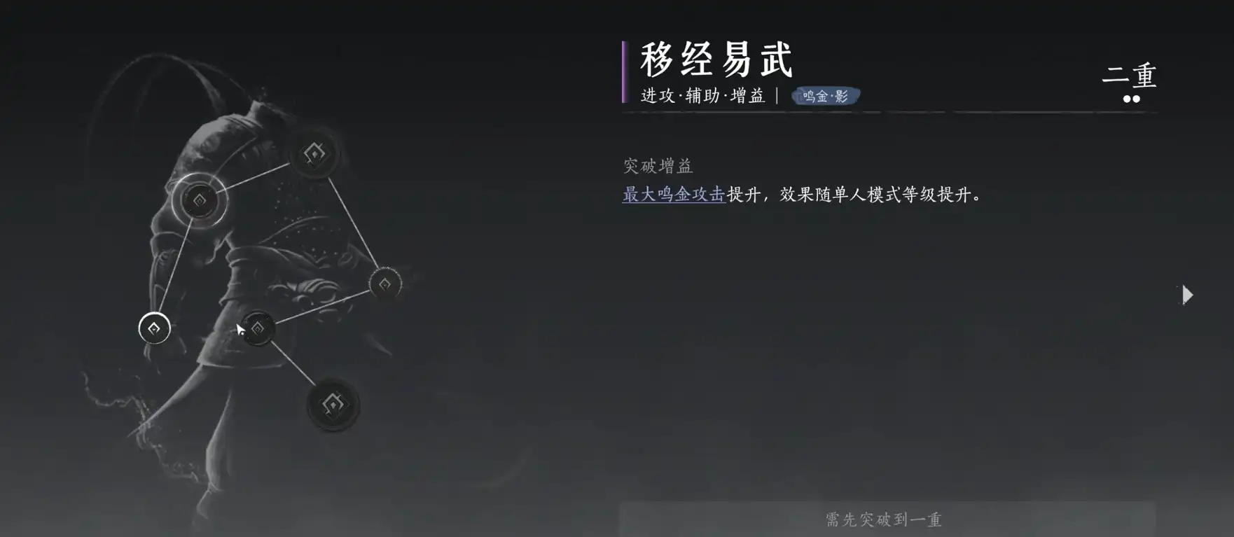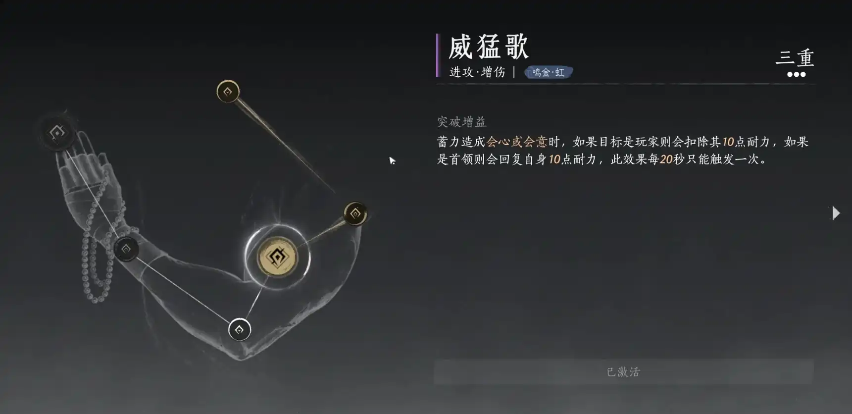 另外两个心法可选择威猛歌和移经易武,威猛歌主要是能提升蓄力攻击时的伤害,并且还能带来会意率的提升,对于需要蓄力的嗟夫刀法来说帮助非常大,而移经易武能提高陌刀的蓄力技和格挡反击后的会心伤害,此效果在实战中能较为稳定地进行触发,限制也比较少,是很适合陌刀的心法。