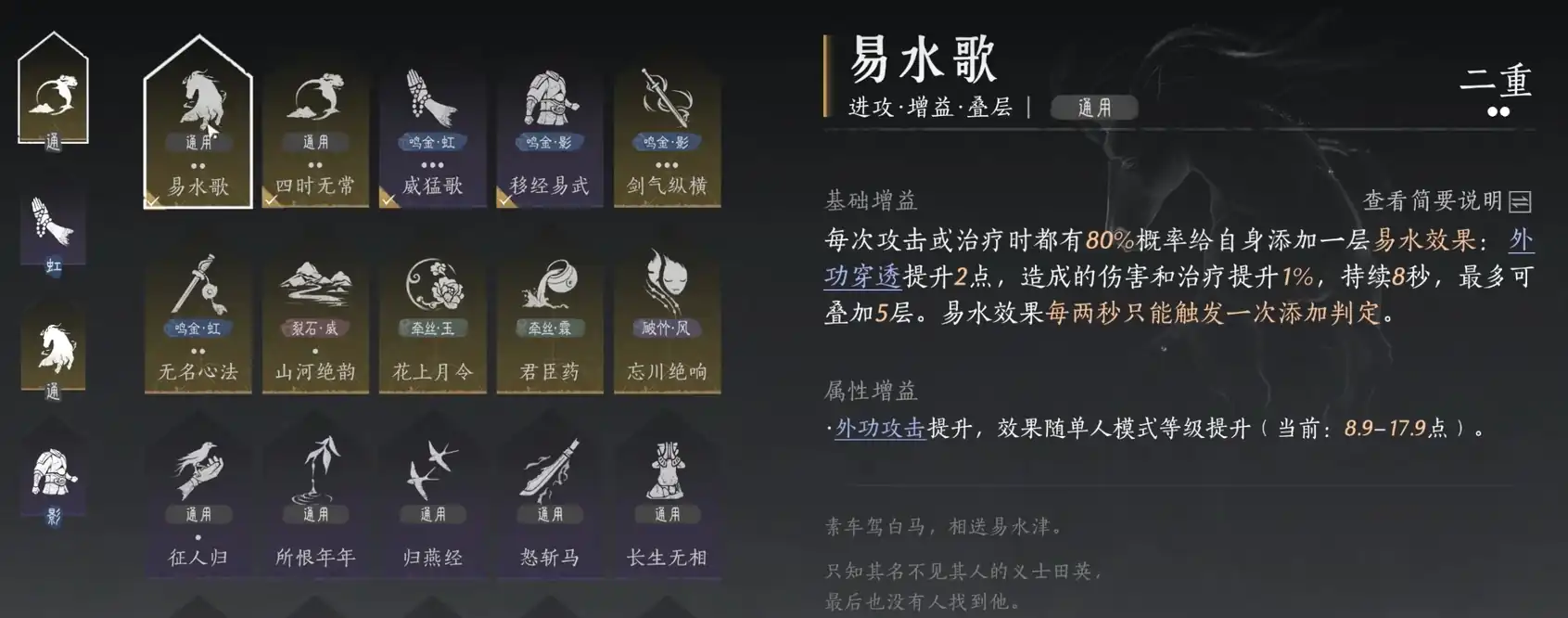 在心法的搭配上最好将易水歌和四时无常带上,前者的易水效果能带来外功穿透和伤害提升,后者四大效果对陌刀来说都是不错的加成,随机到哪一个对人们来说都是可接受的,而这两个心法也是玩陌刀时的标配心法。