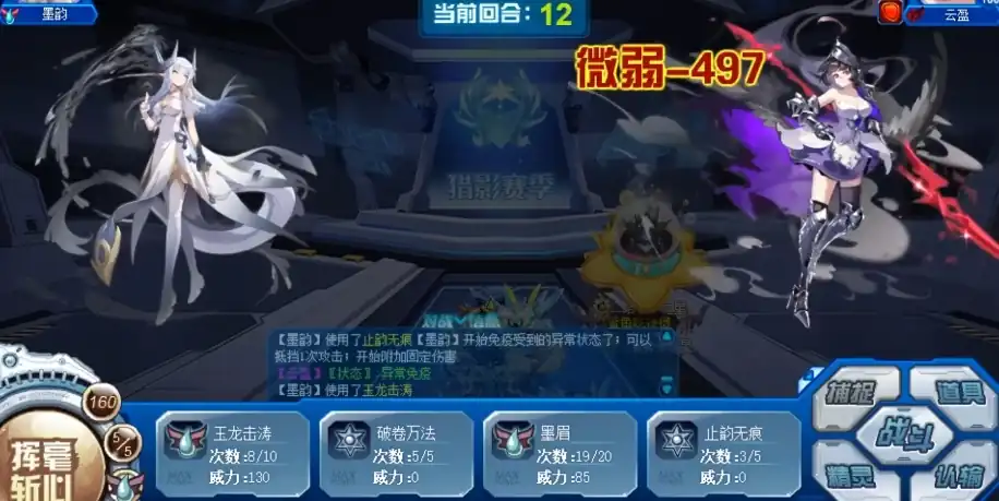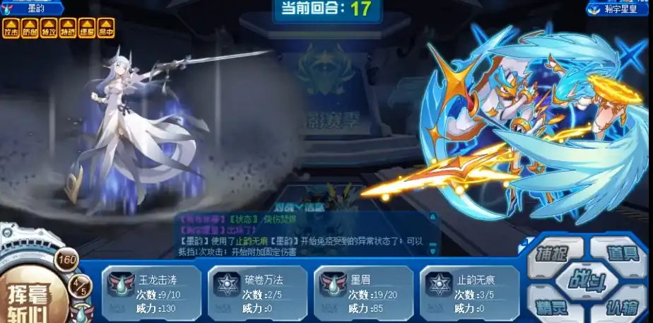 止韵无痕是属性攻击技能,有49%的几率使技能使用成功时,4回合内免疫所有受到的异常状态,抵挡下1次对手的攻击,4回合内每回合都能附加240点固定伤害,浊浪寥寥是水龙特攻技能,有53%的几率随机附加1种非限制类异常状态,破卷万法是属性攻击技能,有57%的几率使技能使用成功时,全属性+1,自身不处于能力提升状态时强化效果翻倍,4回合内每回合若先出手则吸取对手240点体力,下2回合令自身所有技能先制+2。