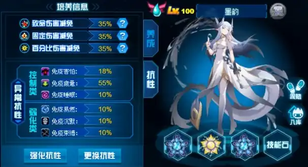 墨韵可以在1回合内使对手造成的攻击伤害减少50%,叠加此效果,当回合结束后,如果本回合对手没有造成攻击伤害,自身会恢复最大体力的1/3,并且在1回合内造成的攻击伤害提升100%,而技能锁敌属于属性攻击是必中技能,技能使用成功时,100%改变自身命中等级+1,水射线是水系特攻技能,有9%的几率在命中后令对方冻伤。