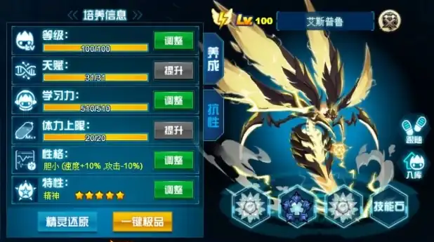在5回合内不会出现异常状态。裂空刃技能在对方体力小于2/1时威力加倍,天雷禁令技能具有先制+3的效果,吸取对手能力提升状态,吸取成功则自身下1回合先制+2,当自身处于能力提升状态时,造成的伤害提升50%,并且先出手时效果翻倍,幻化之盾技能是必中的,可以完全抵挡1次攻击,念力狂暴技能也是必中的,技能使用成功时,100%改变自身的特攻等级+2,电荷灌注技能在先出手时会带来的效果是固定数值伤害。