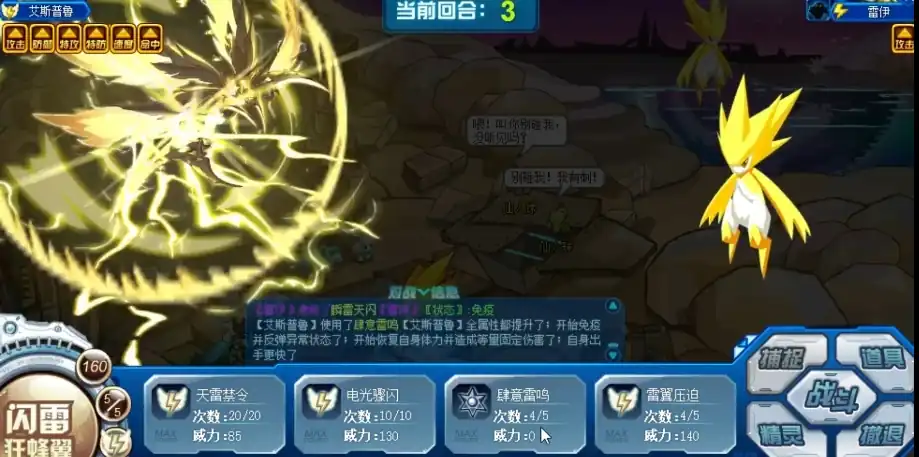 雷翼压迫技能可以随机附加150-300点固定伤害,肆意雷鸣技能是必中的,可以使全属性+1,并且当对手处于异常状态时,强化状态会翻倍,在4回合内这个技能还可以免疫并反弹所有受到的异常状态,同时在4回合内每回合恢复自身最大体力的1/3,并造成等量的固定伤害。,2回合自身所有技能先制+2,痹魂之触技能在本回合打出致命一击后,可以令对手2回合属性技能无效,命中后还会附加对手最大体力1/3的固定伤害,如果未击败对手,则回合结束时恢复等量的体力值。
