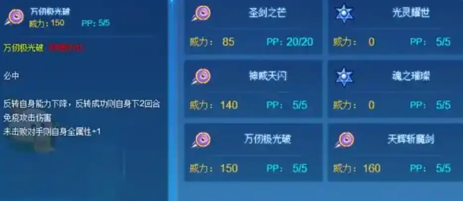 同时在这3回合内,如果自身的能力强化状态被消除,那么对手在接下来的2回合内将无法使用属性技能,万仞极光破这是一个150点伤害、必中的技能,它能够反转能力下降状态,并在反转成功后使自身在2回合内免疫攻击伤害,如果未能击败对手那么全属性+1,这个技能专门针对那些带有弱化效果的精灵,首先必中是这个技能的最低要求,只要试图弱化我方精灵,就能用这个技能进行反击,从而触发免伤条件,实现在弱化状态下的残血站场能力。