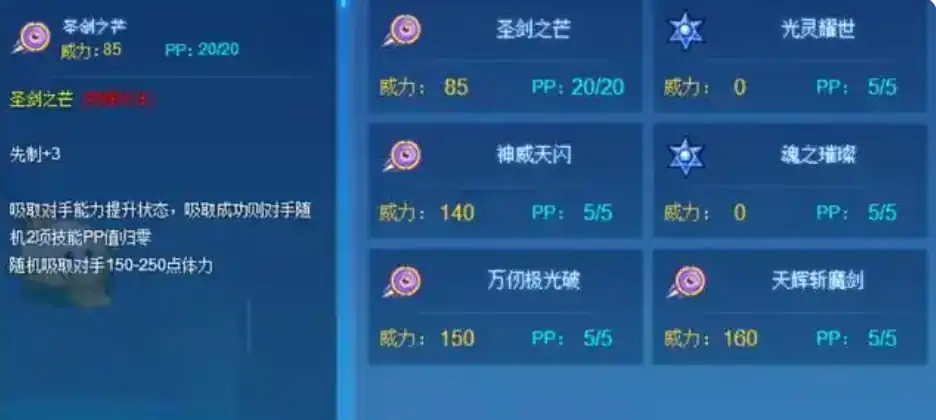 再加上强化补偿免控和威力提升的能力,让这个精灵在本身的最低魂印下限上又进一步提升了作战能力,只要我方能够强化成功并借助先2的情况下使用S级技能石砸到2倍克制的话,那么直接抬走对手将不再是什么难事,至于拉上电石这种4倍克制的情况就更不用多说了一点是直接扬走对手,技能圣剑之芒先3吸取对手强化,若成功则随机两项PP归零。