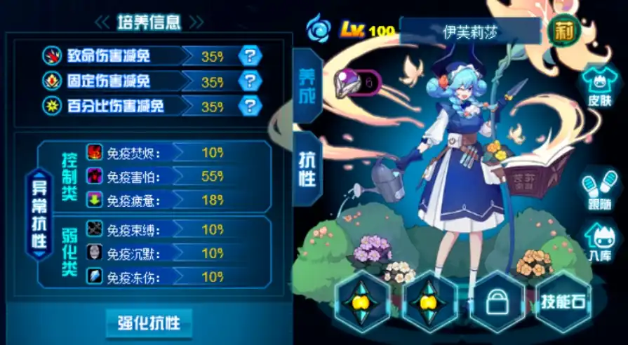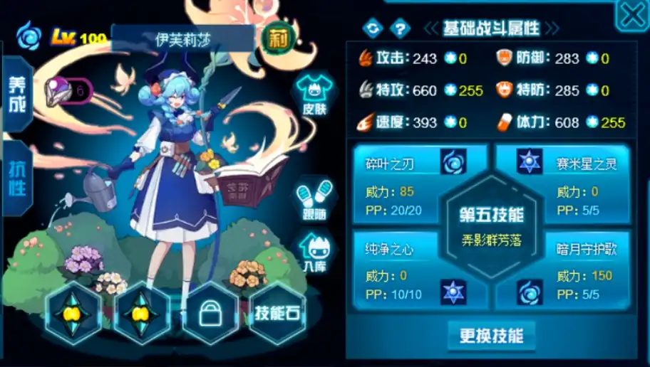 防御神技是青青林莽,这个技能一旦发动在接下来的 4 回合内,伊芙莉莎将免疫异常状态,而且在 4 回合内如果伊芙莉莎自身不处于能力提升状态,就会附加350点固定伤害,这相当于一个被动反击的技能,另外在2回合内,如果对手使用攻击技能,就有50%的几率使对手疲惫,强化神技为落叶之语,这个技能能够使伊芙莉莎全属性+1,并且当自身处于能力强化状态时,强化效果会翻倍。