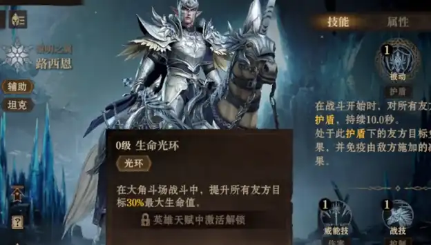 路西恩拥有比较出色的护盾能力,还有治疗能力。黎明誓言被动技能在战斗开始时就可以给所有的友方带来8%的生命值,护盾可以持续10秒的时间。在这一个护盾之下,友方的目标就可以免疫控制效果,也可以给队友带来一个强大的生存保障能力。
