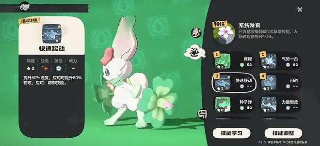 春花兔的快速移动技能可以提升50%的速度,应对时提升80%的物理攻击,特别适合在需要迅速突破敌方防守的情况下使用。赋予了春花兔极高的机动性和爆发力,使它能够在关键时刻打出高额伤害,打破战局。建议在PVP对战中使用这个技能,尤其是在面对速度较低的对手时,春花兔可以先手制敌。