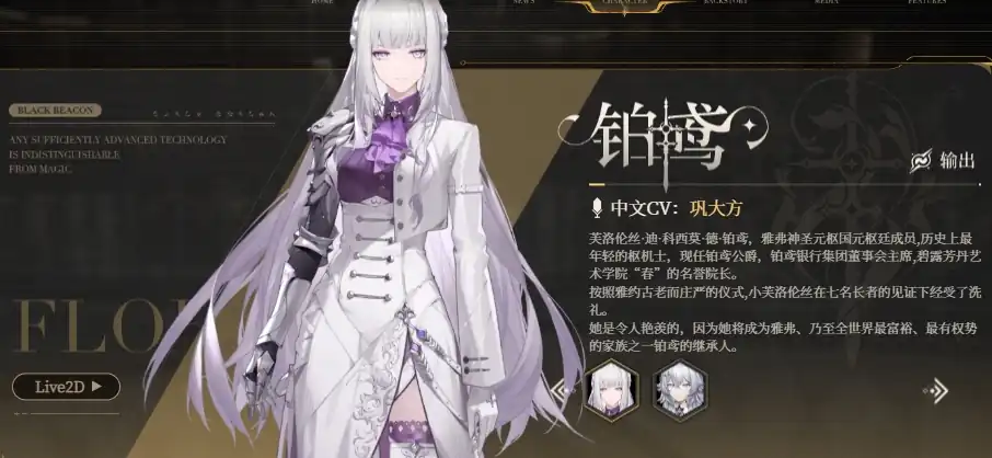 柏鸢是元枢廷成员,目前担任铂鸢公爵,并且是铂鸢银行集团董事会的主席,同时担任碧露芳丹艺术学院“春”系的名誉院长。她的背景故事不仅丰富了角色的人设,也为其技能设计提供了独特的情境。柏鸢的身世和经历使她在游戏世界中具备了非凡的气场,在战斗中的表现也与其贵族身份相得益彰。