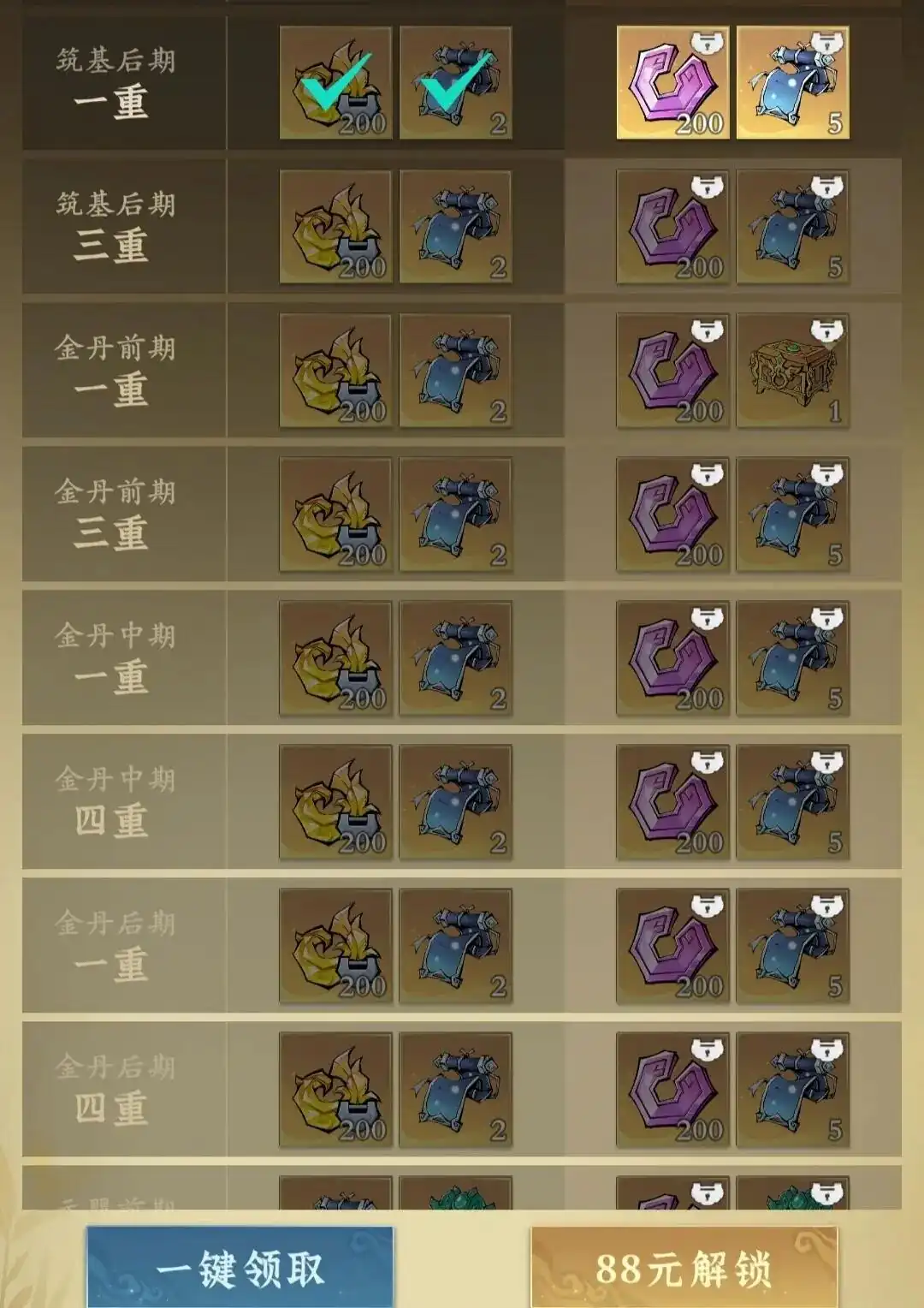 其次要推荐的,就是境界的奖励了,你每提升一些境界,就有资源的补贴可以领取。如果玩家不氪金的话,就没法解锁高级版后面上锁的内容。88元虽然说并不便宜,但是也是很值得的付出。而小编剩下要推荐的,就是紫薇宝库里的礼包。如果你资金有限,那就只选择18元的那一款,氪佬自然是多多益善了。