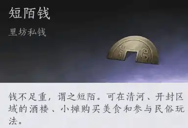 剩下的三种货币就是铜钱短陌钱和宝钱了。宝钱在某种意义上是长鸣玉的下位替代,因为它的主要用途就是购买皮肤,玩家可以用出售食物药品道具的方式来赚取宝钱。而铜钱,则主要是用来购买基础材料的,比如做食物用到的肉块等素材,都需要铜钱来购买。而短陌钱,则是通过市买司跑商玩法进行获取。