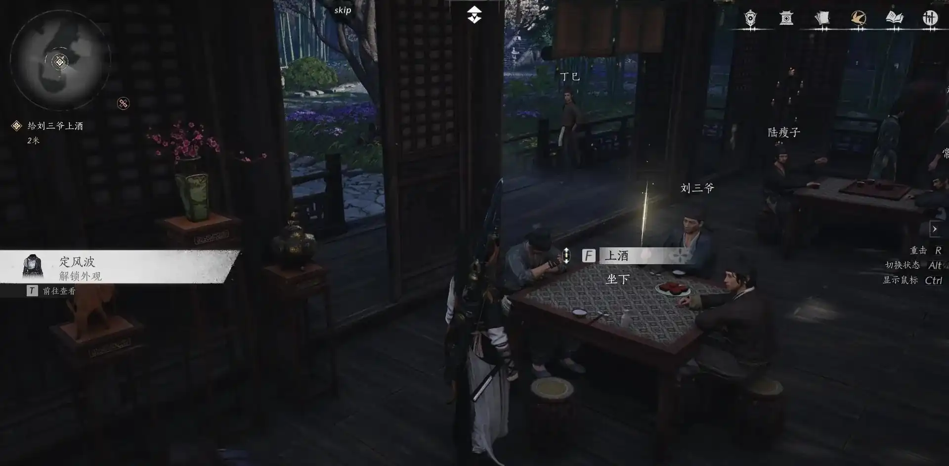 把这一段剧情走完之后,大家可以按f键,来与关键人物刘三爷和鹿瘦子上酒,与他们打听一些相关的消息,消息打听完之后就可以来到不羡仙的厢房,这个任务的玩法还是非常简单的,只需要大家与关键人物见面即可。