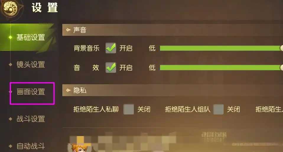 分享了画面调解的方法以后,小编再来粗略的说一说战斗设置和自动战斗设置这两个选项,战斗设置就是设置我们在战斗时的攻击速度以及自动打怪等方面。