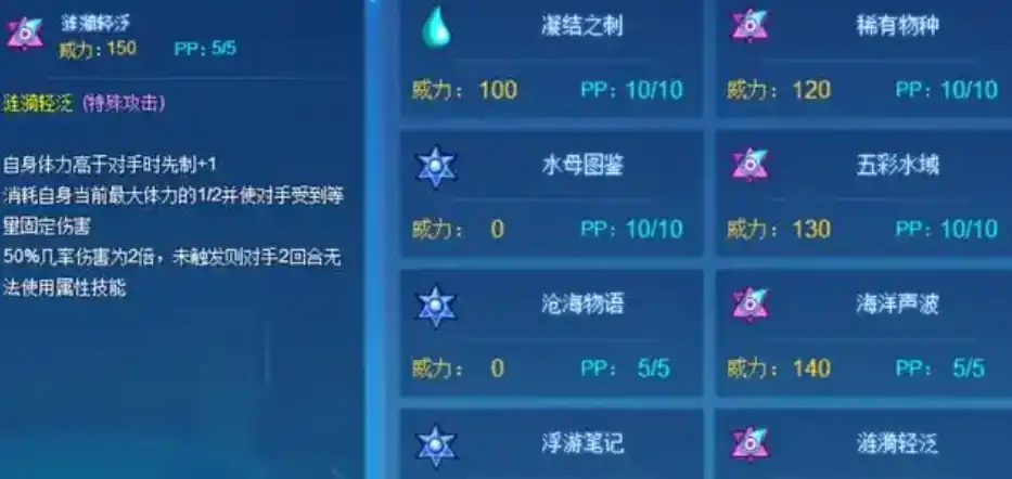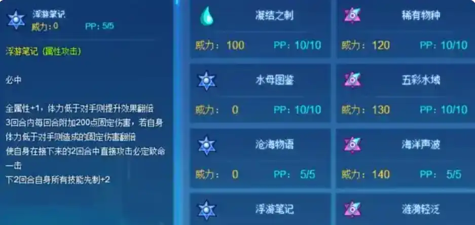 涟漪轻泛是玖莉娜的另一个核心技能,它虽然不是必中的,但在自身体力高于对手时,可以先制+1,这个技能会消耗她当前体力的一半,并使对手受到等量的固定伤害,而且有50%的几率造成双倍伤害,如果未能触发,则对手在接下来的2回合内无法使用属性技能,爆攻爆体流刷法中她的玩法与妖皇、噬梦有些相似,主要以粉色伤害为主。