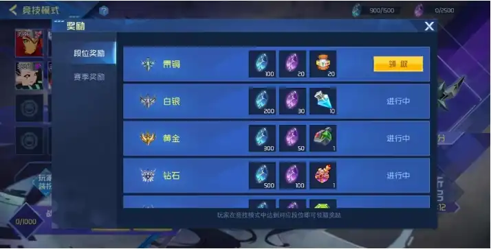 其中,青铜、白银、黄金、钻石四种段位采用积分制,积分范围从最低0分到最高100分,玩家在初始状态下,段位为青铜,初始分数为0分,当玩家在青铜、白银、黄金、钻石段位中通过不懈努力达到100分时,下一次获取胜利后,段位将会晋升至下一等级的0分,而圣皇段位则采用星级制,星级范围从最低0星到最高9999星。
