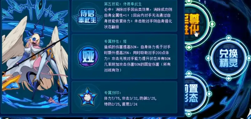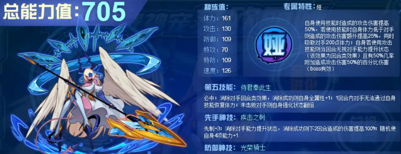 自然祝福技能它可以使自身全属性+1,如果当前体力低于对手,则提升效果会翻倍,接下来的4回合内,每回合都能够恢复自身最大体力的1/3,当自身体力低于一半时,这个技能甚至可以直接将体力回满,破敌冰锥击技能也是必中的,它有25%的几率使伤害变为原来的4倍,如果未能触发这个效果,则会附加300点固定伤害,待君天尽头技能它可以消除对手的回合类效果,当成功消除对手的回合类效果时,自身全属性会+1,如果在未击败对手的情况下使用了这个技能,则下2回合的攻击必定致命一击。