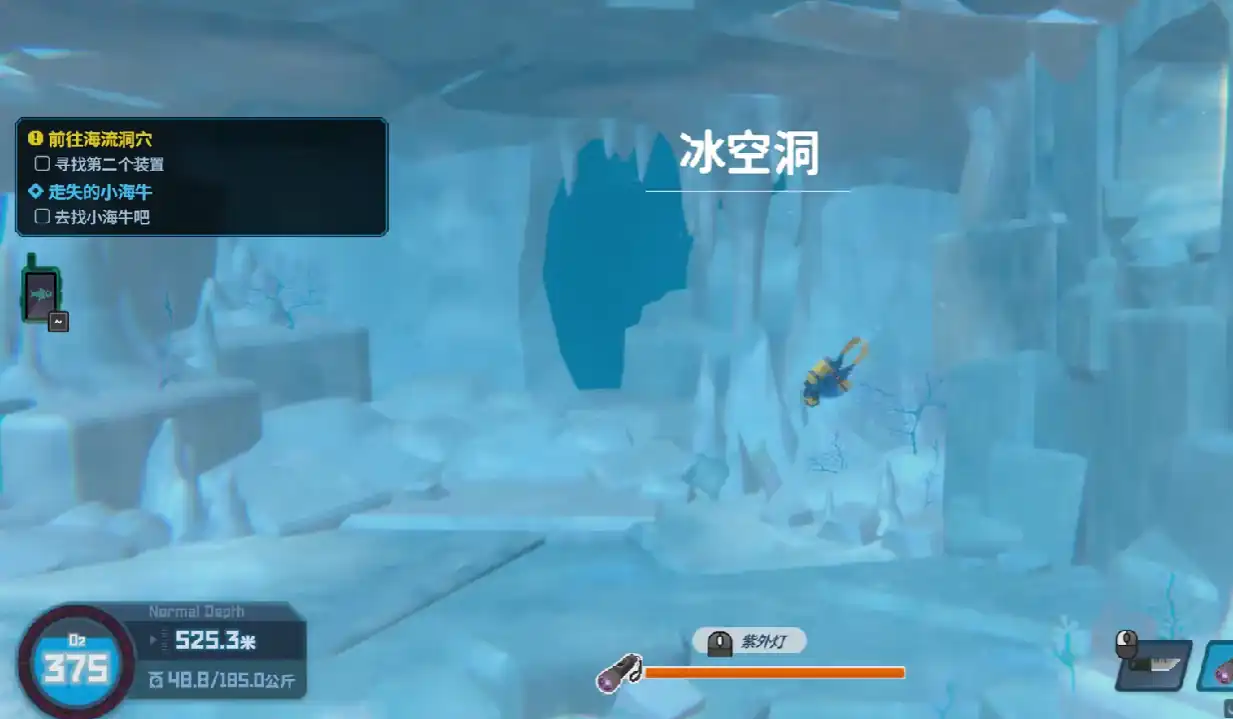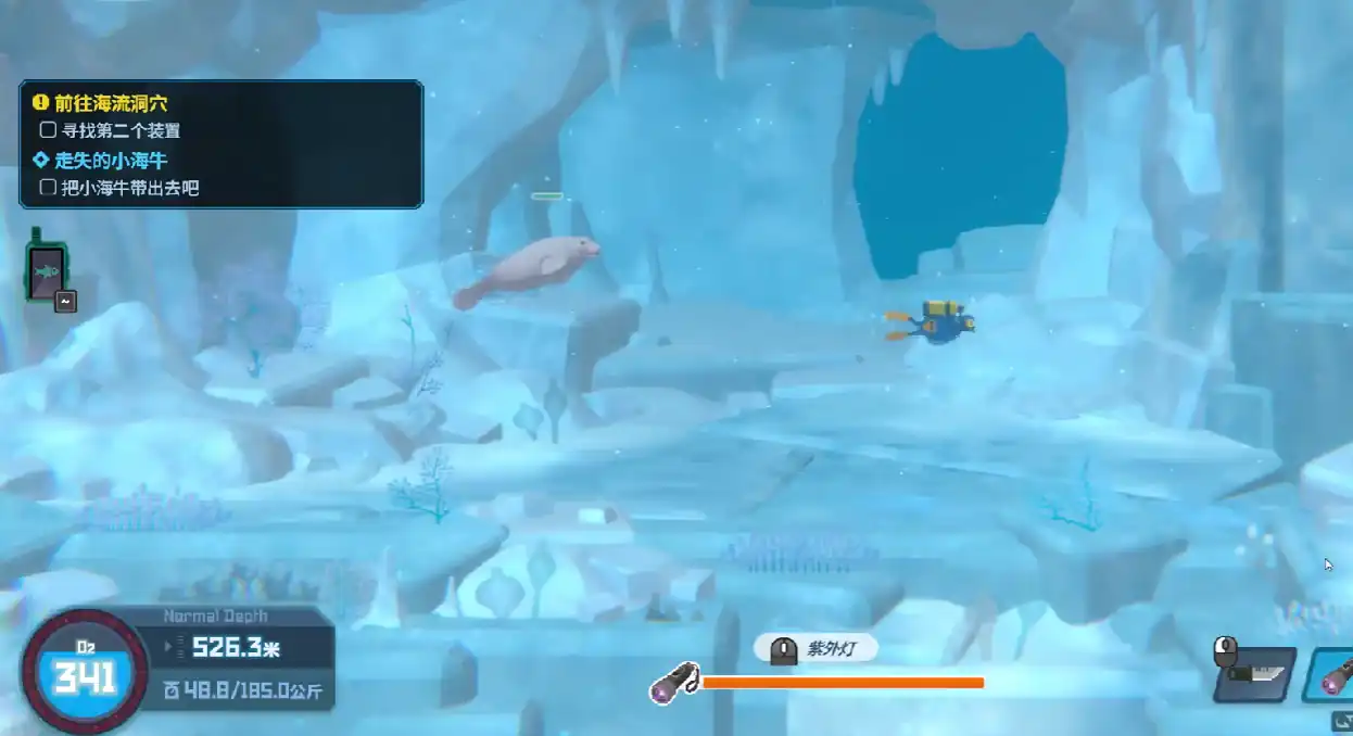在寻找小海牛期间,玩家一定要保证自己的氧气瓶等级已经达到了六级以上,并且潜水服具有耐寒能力,否则在进入到冰空洞之后,玩家的状态就会一直下降。