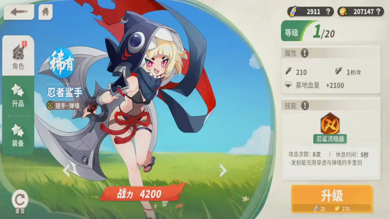 接着讲讲我们前期的一个推荐阵容搭配,猎手的话可以直接使用忍者杀手。忍者杀手这个伤害是相当高的,而且它可以当成一个群攻职业来使用。因为它这个技能比较特殊,就是它有一个回旋飞镖的技能,就是说可以对多个怪物进行一个伤害。就可以当群攻用的。虽然说它是猎手,但是它可以当群攻。