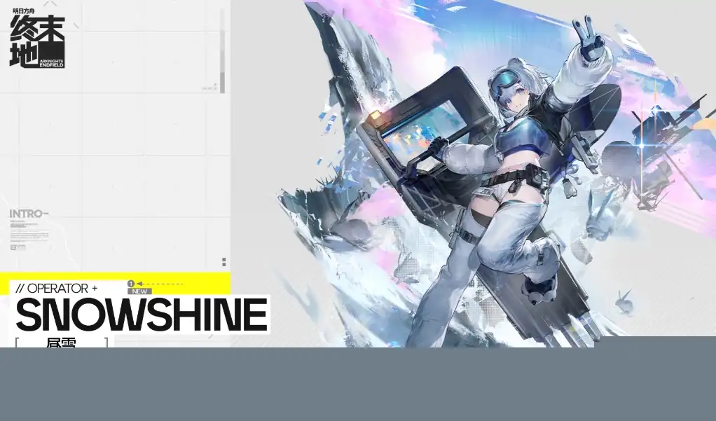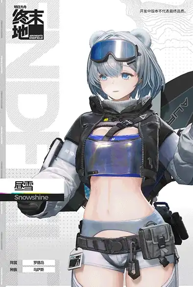 在外观方面,白色短发看起来干净利落,同时头上还有护目镜的装饰,看她的盾牌类武器,以及会是一名强大的救援类防御干员,并且手上也是有着厚厚的手套包裹,在极寒和高海拔地区工作最好的证明,镭射材质的衣服,更是能让大家感受到她的敬业以及专业。