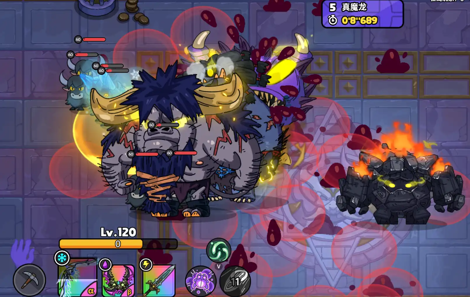角色的话推荐炸弹人,死亡之后不仅有复活,而且每次释放武器技能还会朝目标扔出炸弹,由于第五关真魔龙一共有六个怪物在全屏聚集,所以范围伤害非常重要,装备的话就选择虫戒指来破盾并且保命,冥王套装以及骨链,骨链主要是为了减武器主动技能冷却。这个搭配通关前十个暗金幽殿关卡不是问题。