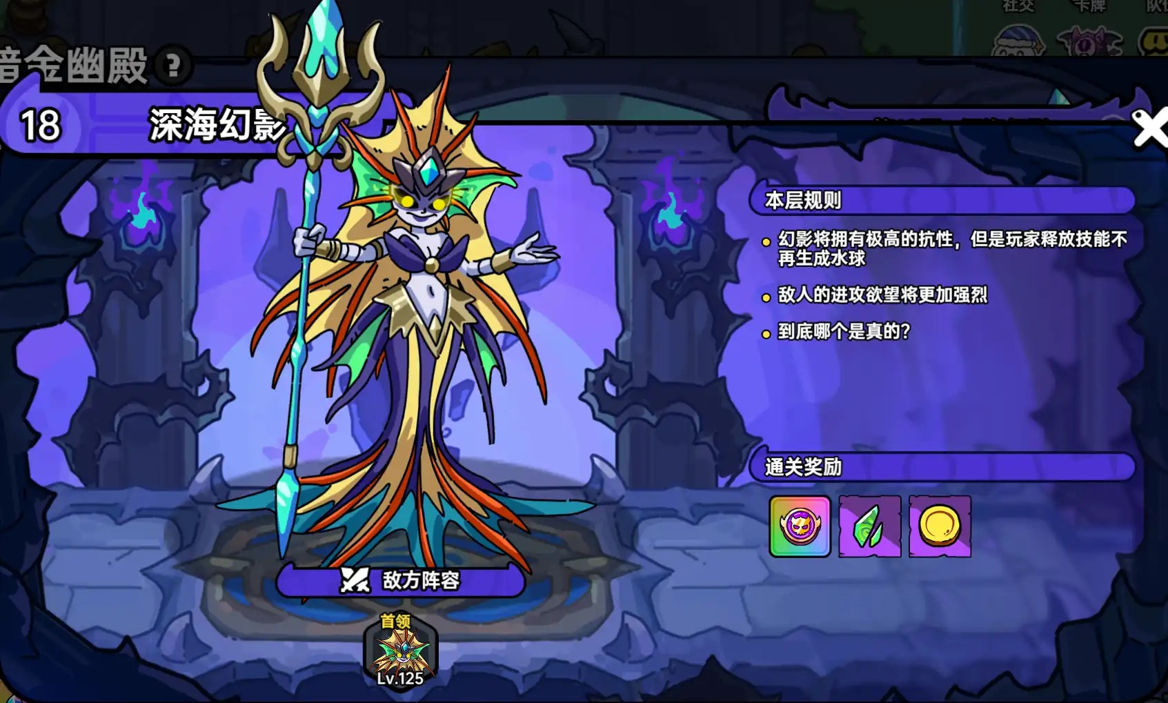 第18层深海幻影,潮汐女神生成的幻影具有极高的抗性,但是玩家们可以使用武器的技能来进行攻击了,不像副本中会生成具有高伤害的水球,而且还会混淆玩家真假幻影的位置。人物的话建议选择吸血鬼,装备依然是雷龙套、至高冥王项链以及虫戒指,选择至高项链是因为玩家血量越低的时候,被动就是获得的免疫控制效果越强,对于这关的控制非常多的条件下非常好用。