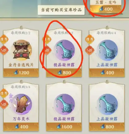 大家如果想要更快升级修炼的话,那就一定要拥有大量的凝神露。最简单的方法就是在商店里面购买,例如遗迹宝库。需要花费800点玉石,就可以直接获得一瓶极品凝神露,400玉石就能获得上品凝神露。