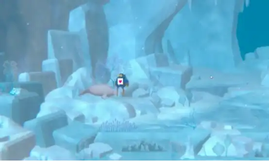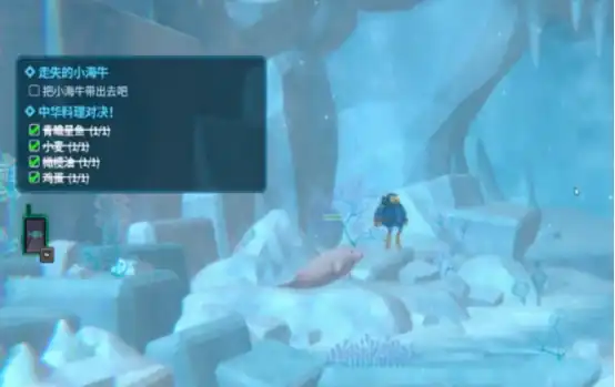 跟随系统指引来到海底深处,寻找到冰空洞之后一直靠左侧,不断的向前游,然后达到冰空洞最左下角。此时就能够看到走失的小海牛了。