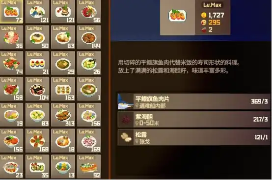 游戏中很多玩家都热衷于制作寿司,我们可以选择制作性价比极高的华美特级寿司套餐,所需要利用到的食材,包括白米饭,青条鳃棘鲈、豹纹鳃棘鲈、泰坦扳机鱼满级之后售价大概为1387元,每消耗一次食材可以做9份。
