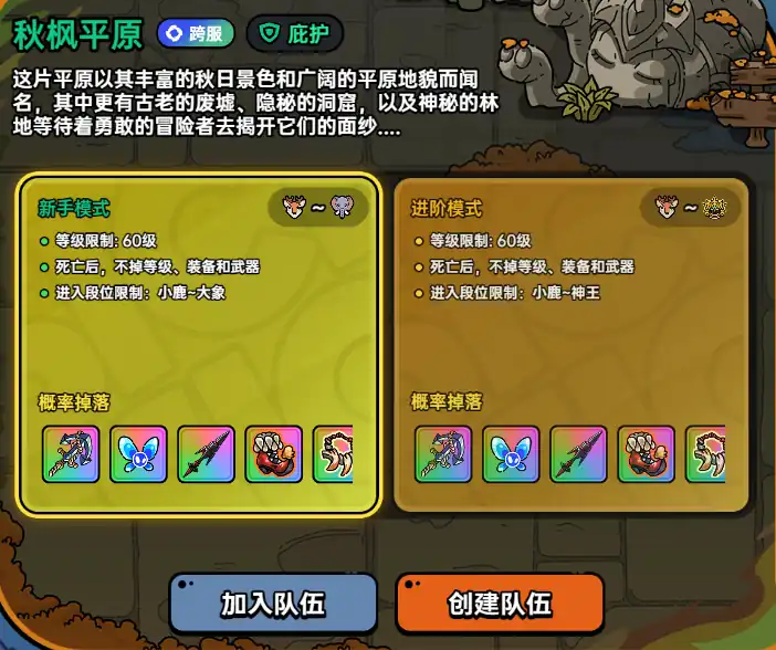 想要去秋枫平原首先要来到英勇小镇的中心安全区内,然后主板块儿的左下角找到驿站使者按一下空格与其交流,在左侧四栏内找到跨服,一般达到小鹿段位就给大家开通了,但是只允许小鹿到大象段位的玩家才可以进入,而且角色等级限制在60级,这就是为了避免太多高玩欺负萌新。