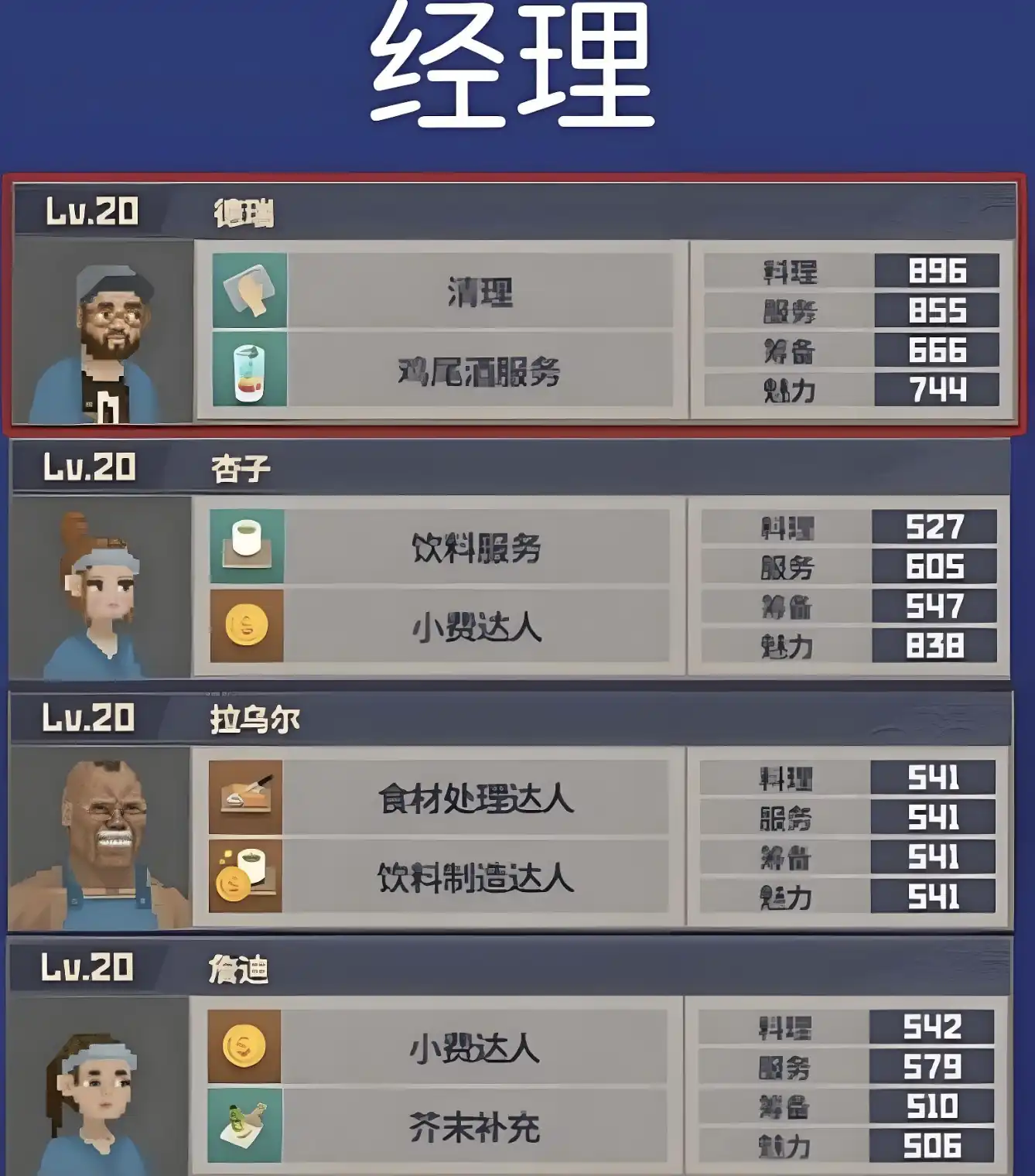 先来说说经理推荐,首推德瑞。这德瑞可太厉害了,各项属性都高。等升到10级的时候,就能解锁5星技能,什么菜都能做,有他在厨房,菜品这块完全不用担心。而且到15级还能获得冰鱼咖喱,这是咖喱派对毕业菜的首选。他还能迅速清扫餐馆垃圾,还能提供鸡尾酒服务,简直是全能型人才。