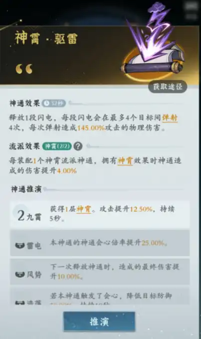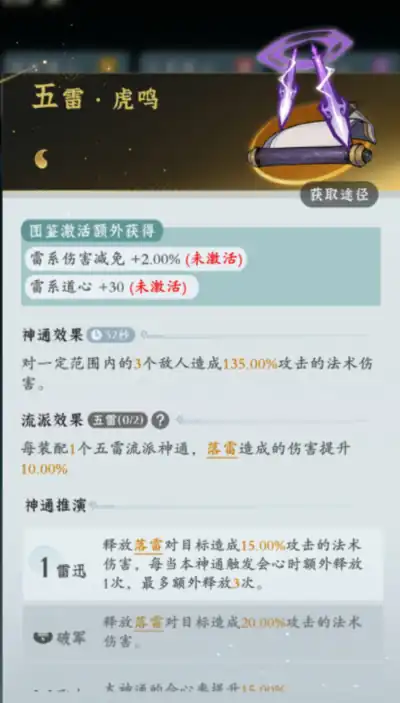 之后这第一个流派的技能看完后,就要来看第二个流派了,该流派叫做五雷流,这一流派拥有五雷雷法,大家需要带四个五雷雷法的技能,这四个技能建议大家带天罡、龙吟、惊蛰和虎鸣。