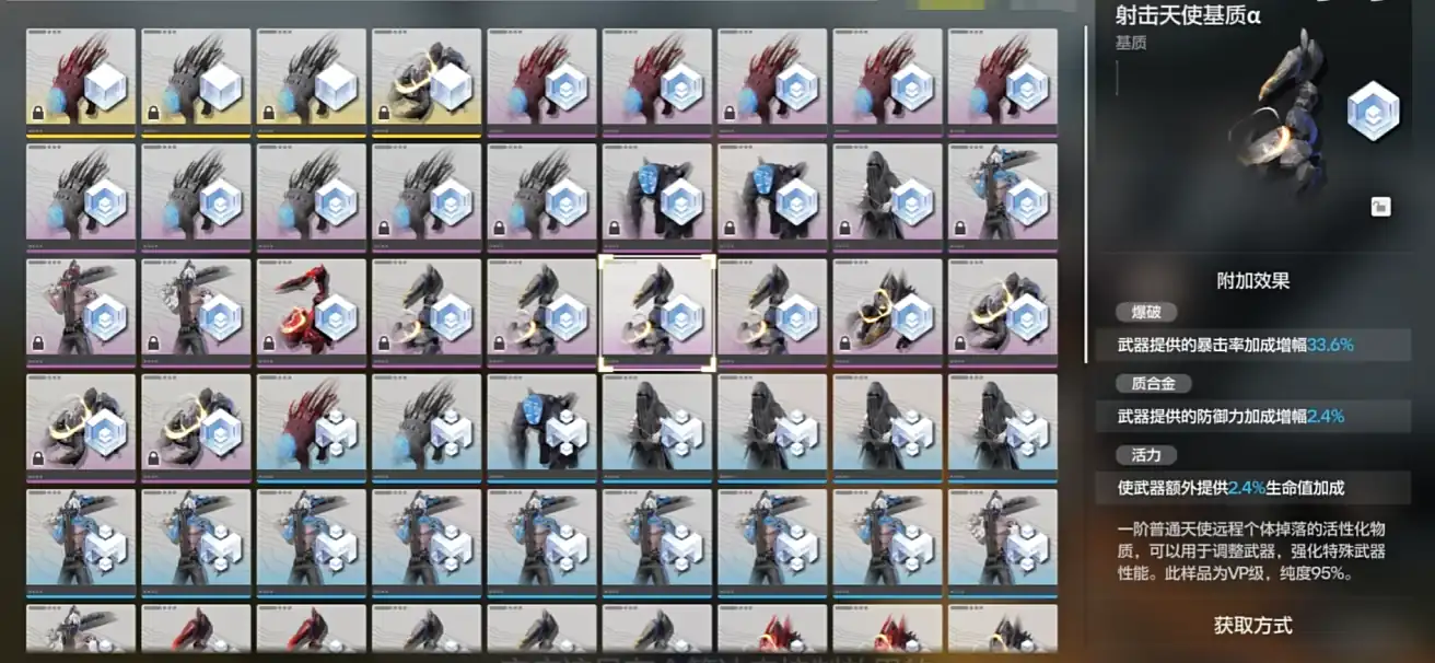 2、武器:该游戏的武器都会直接加算一些攻击力,然后在此基础上提供不同属性的百分比增幅,包括攻击力、生命值、防御力、破防力、暴击率和暴击伤害。然后除了数值的直接提升,还有一个武器被动技能,玩家可以从这个被动技能基本上推断出它更适合哪个角色。武器有两个养成点,武器也有独立的等级系统,通过消耗其他武器和武器升级经验包升级也是每十级就要突破一次。不过武器的特破是不需要吃同一个武器的,只需要吃那种普通的武器突破素材就好。其次是一个叫做活性化的系统,它允许问玩家的武器装备一个【基质】来进行强化,大家可以打这个功能理解成词条,不过是随机的吗,但是优先级是比较低的。基质可以通过打怪掉,从低到高分为绿色、蓝色、紫色、金色品质。其中金色品质的基质只能通过三个紫色同类机制合成而得。敌人等级越高,掉出来的品质就会越高。一般打40级以上的敌人就会爆紫色的基质。