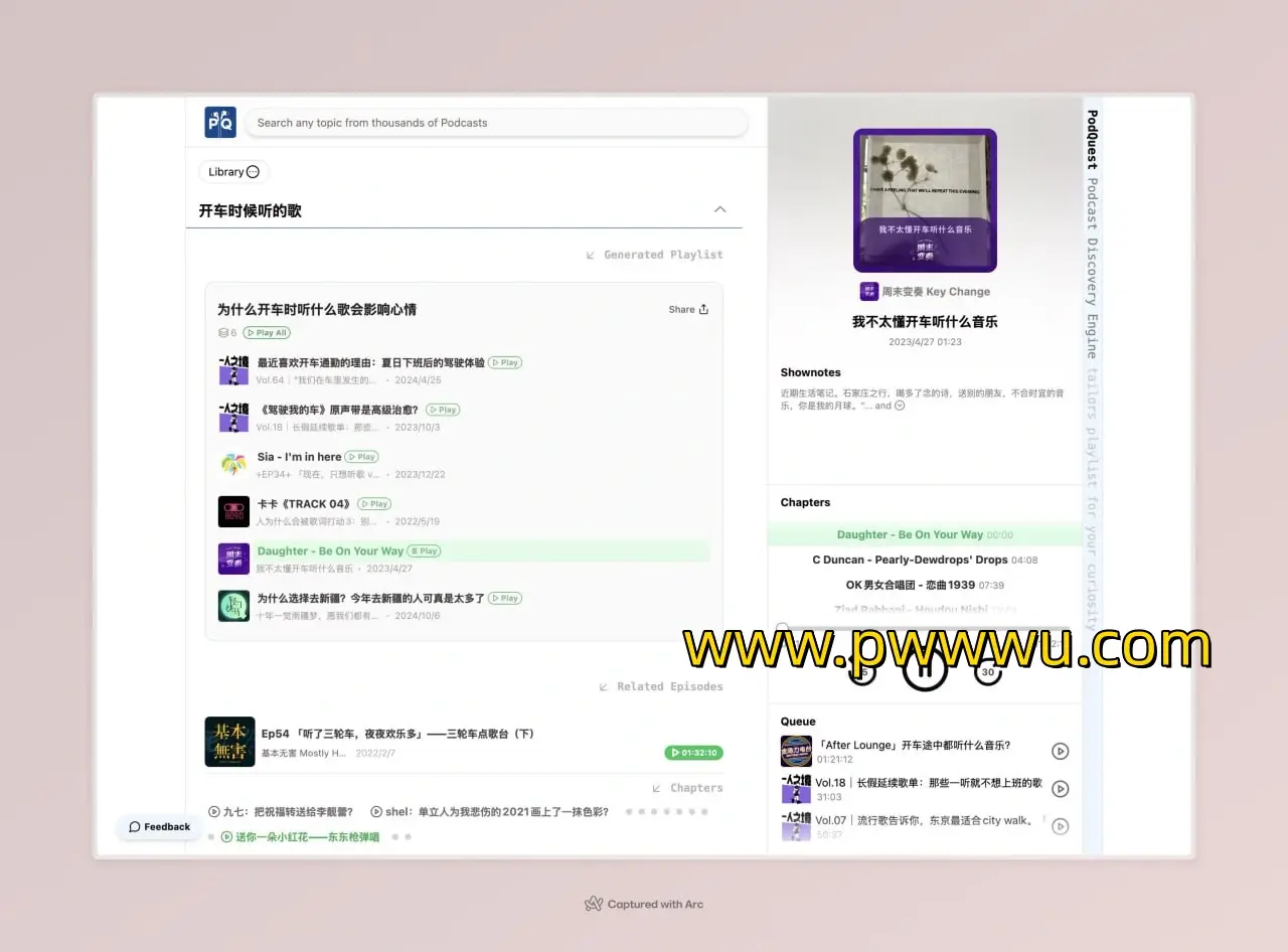 PodQuest是一款播客搜索工具,它通过语言描述来帮助用户快速定位他们想要的播客内容。这项服务以其全文和语义搜索能力而自豪,能够覆盖大量的播客资源。用户只需输入他们感兴趣的话题或关键词,PodQuest便能立即展示相关播客内容,并支持即时播放功能。它还能提供精确的时间戳和文字稿,方便用户快速定位到播客中的具体片段。最重要的是,PodQuest完全免费,不收取任何费用,用户可以尽情享受这一便捷的服务。