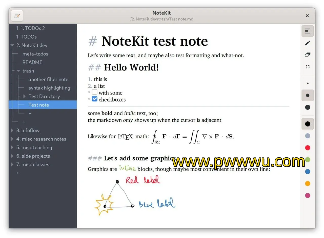 Notekit是一款功能丰富的编辑器,它不仅支持手写笔记功能,还具备直观的所见即所得的Markdown编辑能力。用户可以通过鼠标、触摸屏或数字笔在编辑器中轻松添加手写笔记,使得记笔记的过程更加直观和便捷。这款编辑器以其直观的操作界面和强大的功能,为用户提供了一种全新的笔记体验。