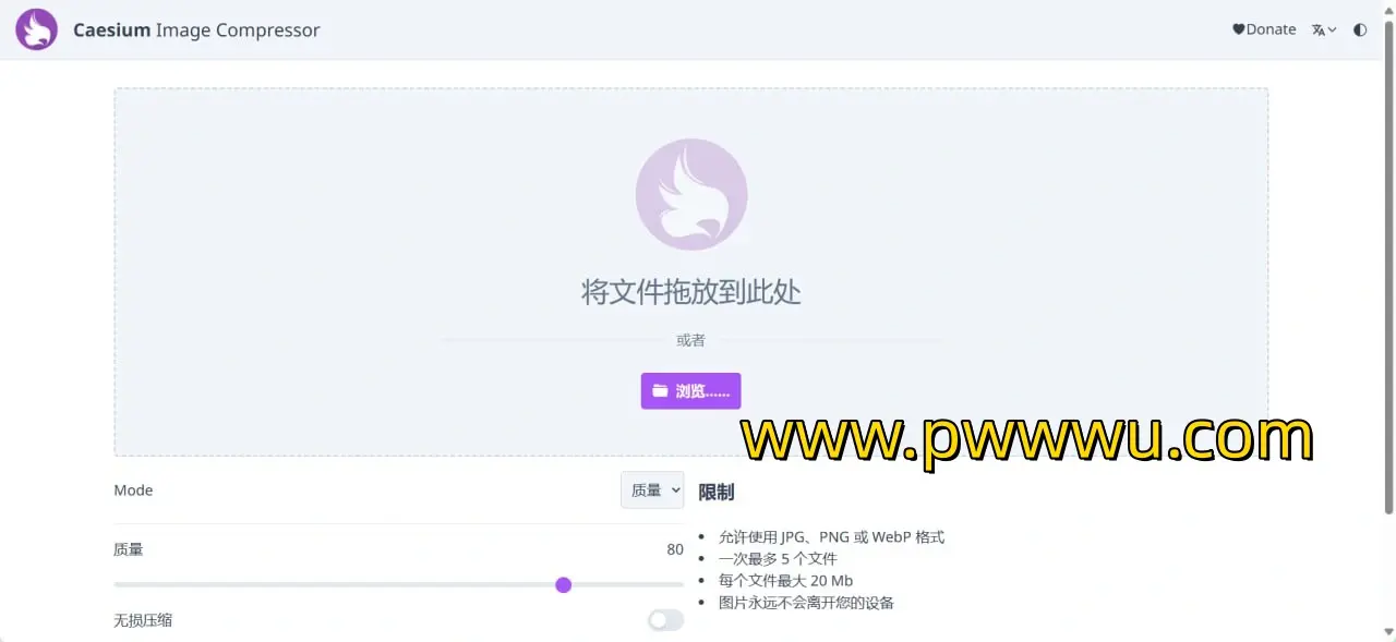 Caesium 是一款高效的图片压缩工具,支持 JPG、PNG 和 WebP 格式的图片处理。用户可以一次性上传多达五个文件,每个文件的大小限制为20Mb。重要的是,Caesium 确保图片在处理过程中始终保留在用户的设备上,不会进行任何形式的外部传输,从而保护用户的隐私和数据安全。