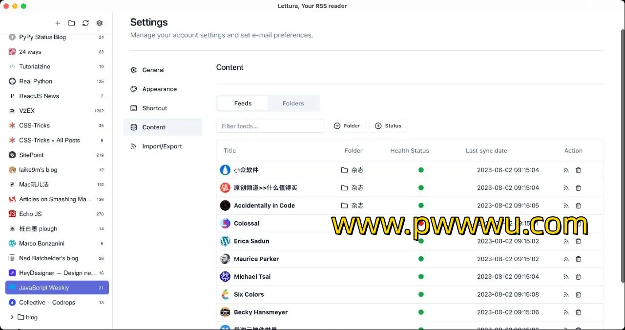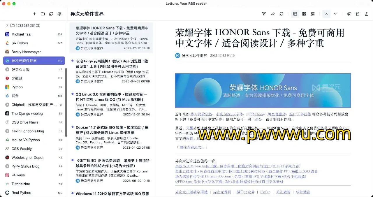 Lettura是一款开源且免费的RSS阅读器,专为macOS和Windows系统用户设计。它不仅免费,而且开源,使得用户可以自由地订阅和管理RSS与Atom格式的内容。Lettura以其简洁的用户界面和强大的功能,为用户提供了一个高效的信息聚合平台,帮助用户在众多网站和博客中快速获取更新。通过Lettura,用户可以集中阅读他们感兴趣的新闻、文章和博客,而无需频繁访问各个网站。Lettura还提供了一些高级功能,如文章的离线阅读和内容过滤,进一步提升了用户的阅读体验。