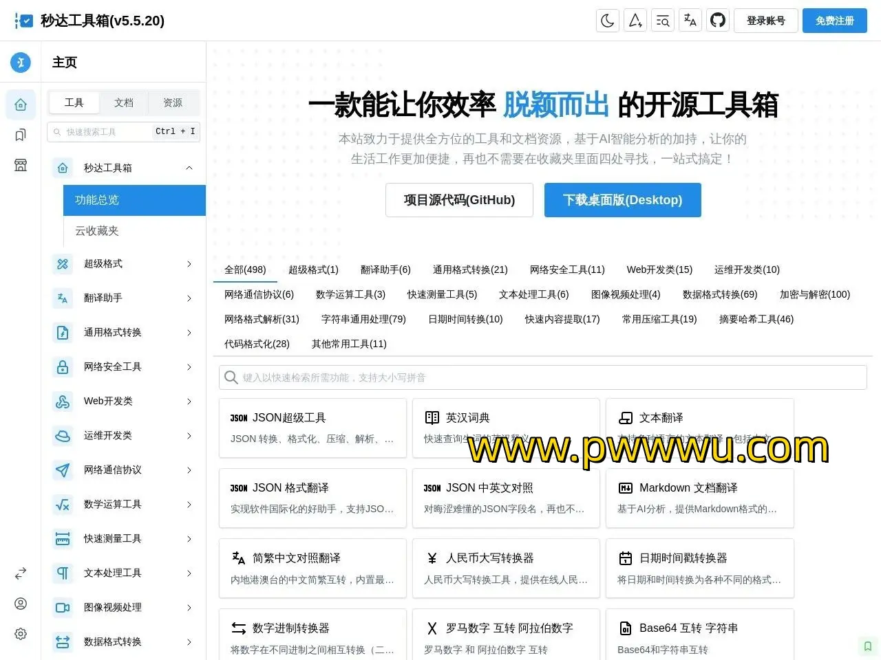 秒达工具箱,一款开源工具箱,旨在提升你的工作效率。它集成了多种在线工具、文档笔记和编程资源,帮助你轻松处理日常工作任务。无论是寻找准确的信息,还是进行高效的编程开发,秒达工具箱都是你的理想选择。其开源特性意味着你可以自由地访问和使用这些工具,无需担心版权问题。通过这些精心挑选的工具和资源,你的工作流程将变得更加流畅和高效。