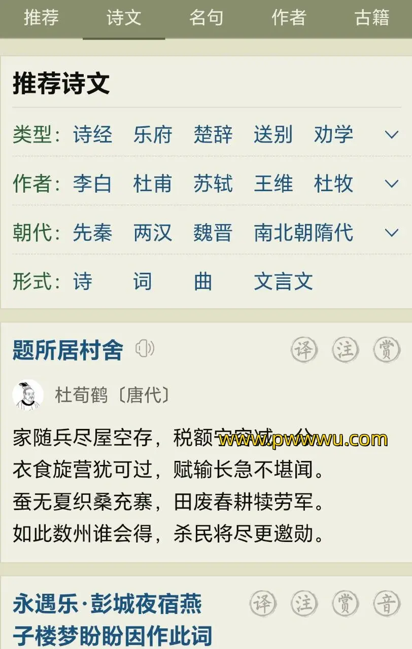 网站精心设计,力求为用户提供一个直观且易于操作的界面,无论是在电脑上浏览还是在移动设备上下载APP,都能享受到流畅的体验。在这里,用户可以发现从先秦到明清的丰富诗词资源,包括但不限于诗经、楚辞、汉赋、唐诗、宋词等,涵盖了中国文学史上的璀璨瑰宝。