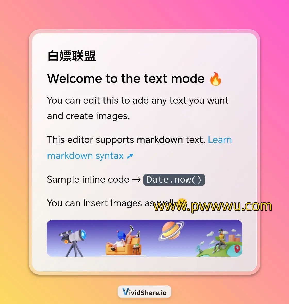 VividShare以其简洁直观的操作界面和强大的功能,满足了用户在社交媒体上分享高质量视觉内容的需求。无论是社交媒体达人还是专业设计师,都能在这个平台上找到适合自己的工具和模板。通过VividShare,用户可以轻松地将他们的创意转化为引人注目的图片卡片,无需复杂的设计软件。