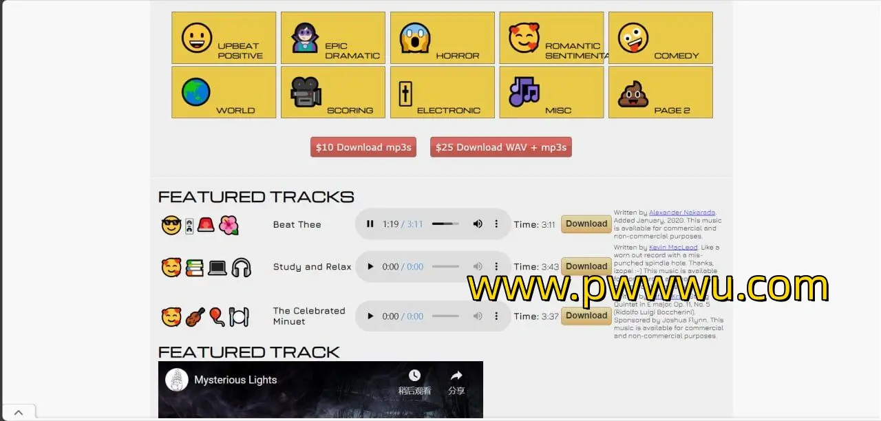 FreePD是一个提供丰富音乐素材的免费下载网站,无版权问题,商业用途也无妨。网站涵盖了多种风格的音乐和音频素材,如积极乐观、恐怖、浪漫、喜剧以及电子音乐等,满足您不同场合的需求。所有素材均可免费下载,无需注册或登录,方便快捷。网站还提供在线试听功能,让您在下载前就能预览音乐效果,确保音质符合您的期望。无论是背景音乐还是特效音,FreePD都能为您提供高质量的素材选择。
