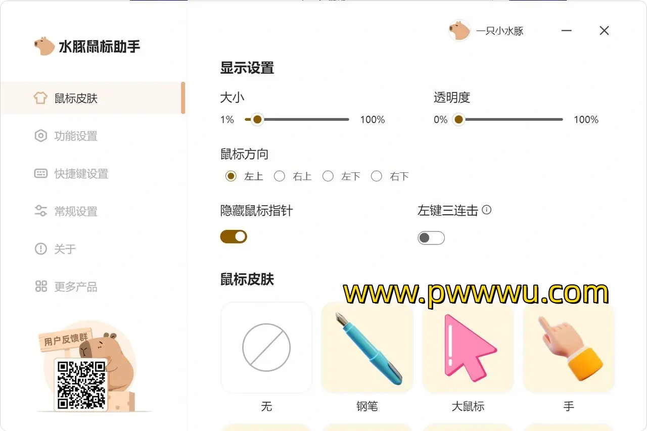 水豚鼠标助手是一款专为Windows系统设计的多功能屏幕演示工具。它集成了鼠标换肤、屏幕画笔、放大镜、聚光灯、屏幕放大、倒计时和白板等多种实用小工具,非常适合在录制屏幕演示或进行演示时使用。
