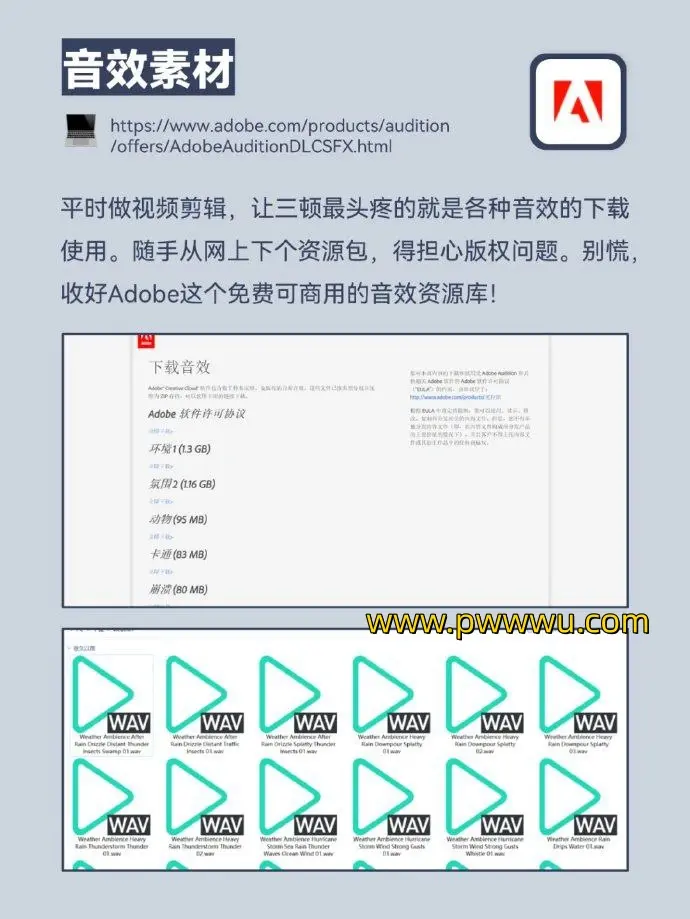 Adobe Creative Cloud软件为用户提供了成千上万的高质量未压缩、免版税音频音效。这些音效文件经过精心分类,并被打包成ZIP格式以便于下载和使用。用户可以轻松地根据音效类型进行选择,从而快速找到所需的音频资源,提高工作效率。通过这种方式,Adobe Creative Cloud为音频制作和编辑提供了极大的便利。