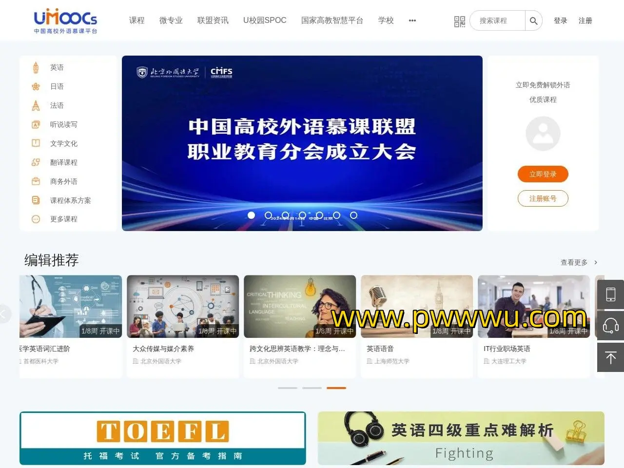 中国高校外语慕课平台(UMOOCs)是一个致力于提供高质量语言学习的免费资源网站。该平台由多家高校与Mooc合作推出,汇集了众多高校教师的精彩课程,旨在超越市场上现有的网络课程。UMOOCs以其专业性和免费提供的优势,成为学习者的理想选择。