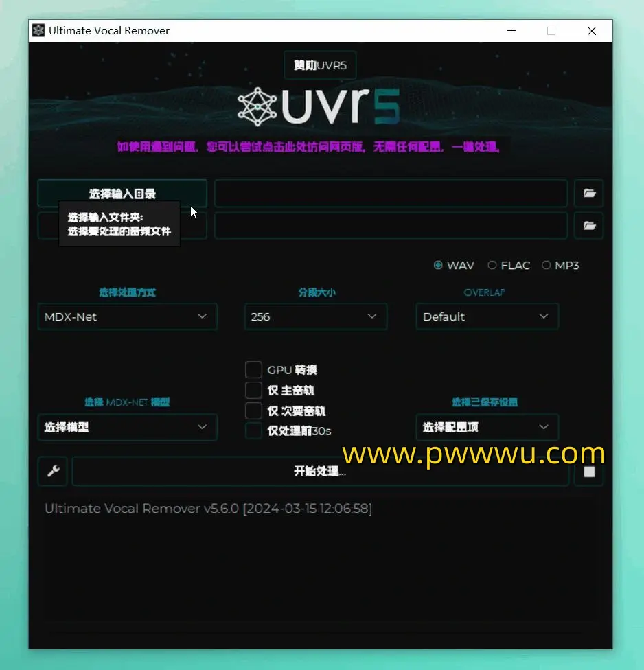Ultimate Vocal Remover GUI v5.6(简称UVR5)是一款高效的电脑软件,专门用于分离音乐中的人声和伴奏部分。它不仅免费使用,还是一款卓越的视频背景音乐提取工具。UVR5以其精准的音频处理技术和用户友好的操作界面,为广大音乐爱好者和视频制作者提供了极大的便利。