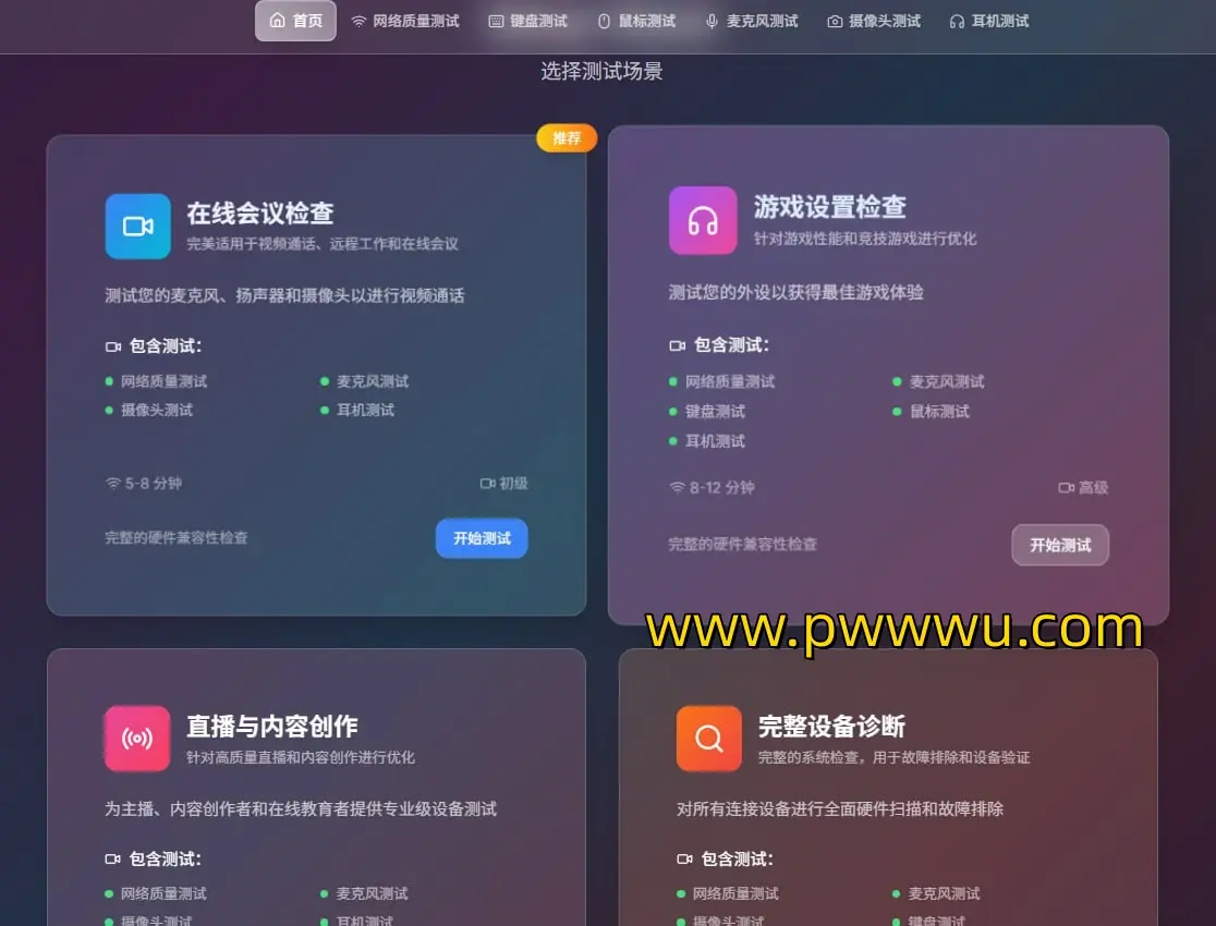 Setup Check是一个专为设备性能检测而设计的平台。它能够让用户轻松检测摄像头、麦克风、扬声器、键盘、鼠标以及网络连接的质量。这一平台的目的是确保用户在进行在线会议或玩游戏时,设备能够发挥出最佳性能。