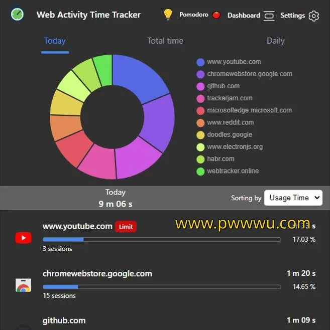 网络活动时间跟踪器是一款专为浏览器设计的扩展程序,旨在帮助用户监控在不同网站上投入的时间,以深入洞察个人的网络使用习惯。通过这一工具,用户不仅能掌握自己的在线行为模式,还能有效屏蔽那些可能分散注意力的网站,从而显著提升专注力和工作效率。