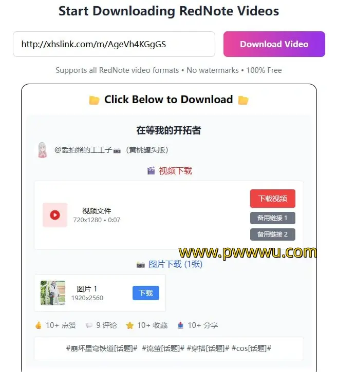 RedNote Video Downloader是您下载小红书视频的强大工具。使用这款应用,您可以轻松保存您喜爱的小红书上的高质量视频。它是一个无需注册、完全免费的应用,适用于所有设备。