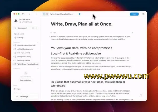 AFFiNE的多功能性使其成为现代工作环境中不可或缺的工具。无论是创建内部wiki、管理项目文档,还是进行团队协作和演示,AFFiNE都能提供一站式服务。用户可以轻松地将各种内容整合到一个平台上,从而减少在不同工具间切换的需要,节省时间和提高工作效率。