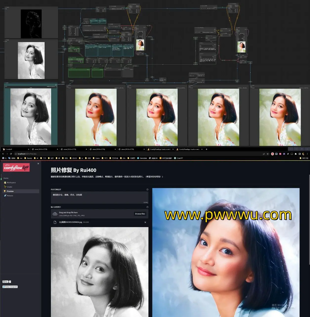ComfyFlowApp 是 ComfyUI 的一项扩展工具,旨在简化从 ComfyUI 工作流中开发 Web 应用的过程,以此降低使用 ComfyUI 的难度。通过这一工具,用户能够轻松将复杂的工作流程转换为用户友好的 Web 应用。以人像修复工作流为例,ComfyFlowApp 能够将其转化为一个易于操作的应用程序。