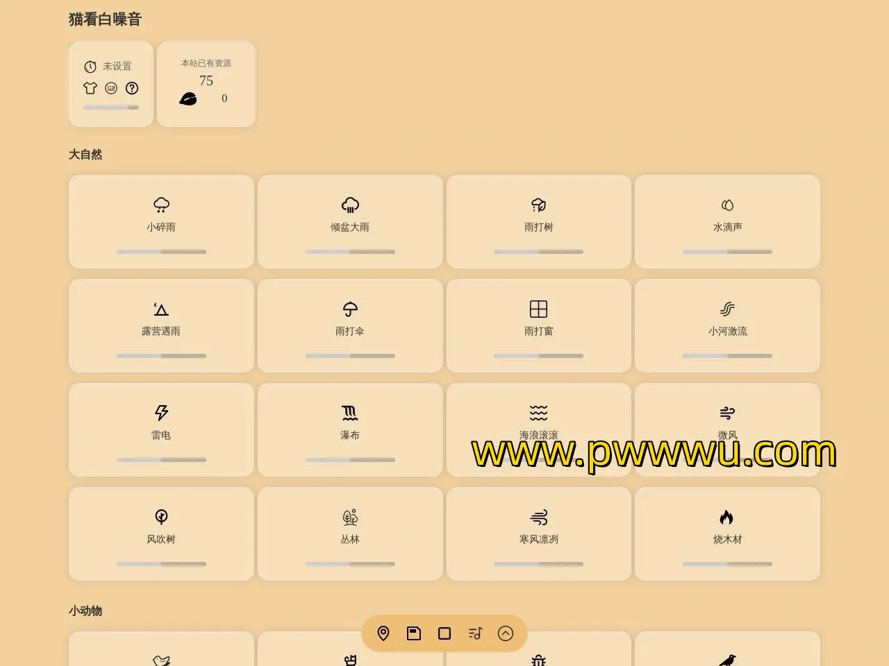 猫看白噪音,一个专注于纯净白噪音的在线平台,旨在助您放松神经、提升睡眠质量,以及增强工作效率和学习效果。在这里,您可以自由选择并组合各种自然声音,包括雨声、风声和海浪声,打造专属于您的听觉盛宴。在夜深人静之时,让您沉浸在大自然的宁静之中。
