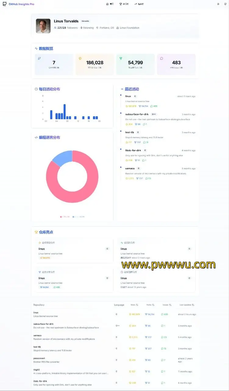 平台的设计注重用户体验,使得用户可以轻松访问和分析数据。无论是想要了解顶级开发者的最新贡献,还是追踪特定开源项目的最新进展,GitHub Insights Pro 都能提供直观的界面和深入的分析工具。这样的工具对于开发者、项目经理以及任何对 GitHub 数据感兴趣的用户来说,都是一个不可或缺的助手。